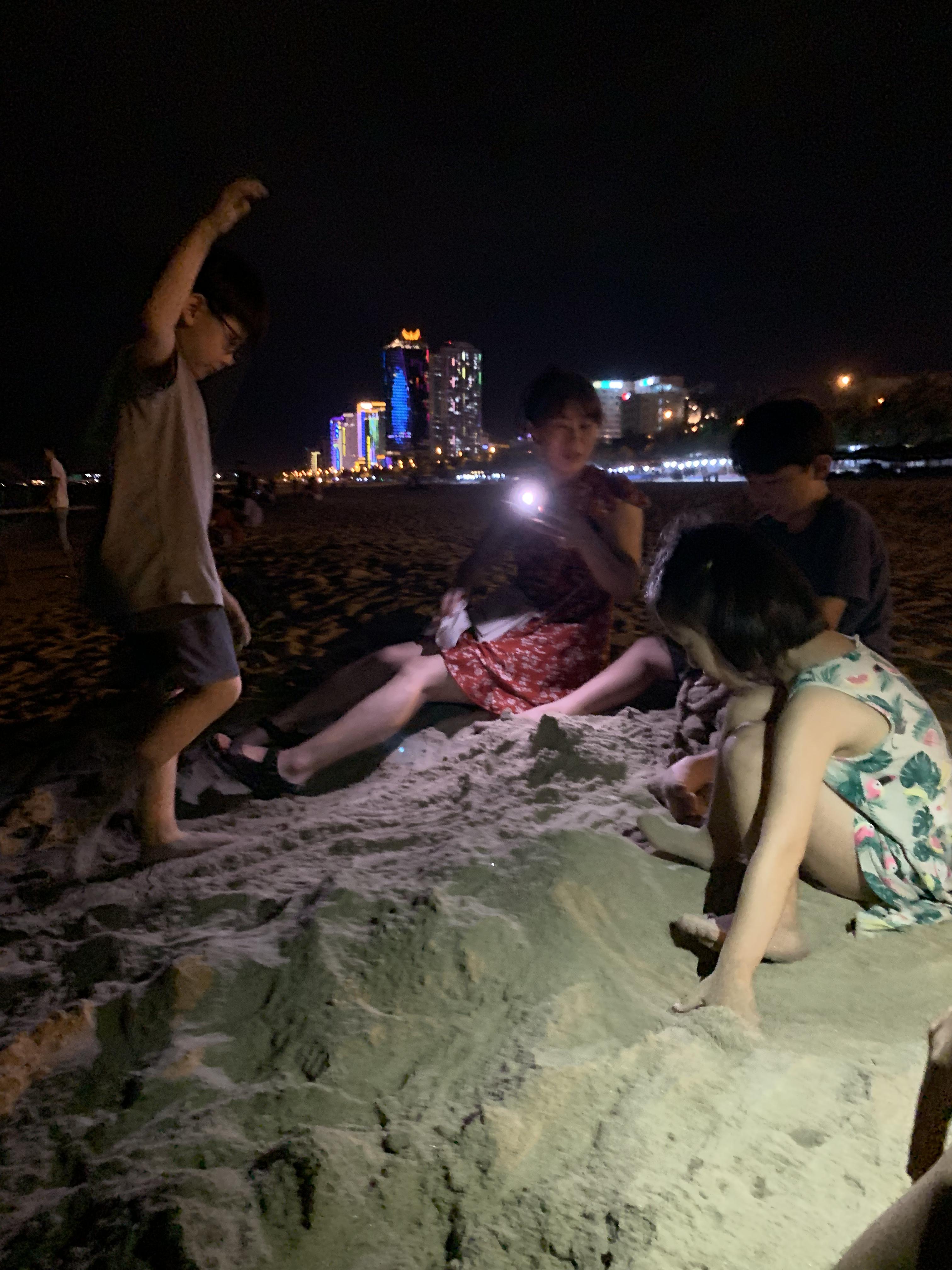 미케비치에 가서 보이지 않던 깜깜한 바다를 앞에 두고 모래 놀이에 빠져있는 가족들.